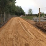 Die Drainage ist bei dieser Zufahrt von größter Bedeutung, da es in England häufig regnet. Der Züchter hat selbst für den Regenwasserabfluss der Zufahrt gesorgt. Ein mit einer Drainagerohrleitung versehenes Kiesbett garantiert eine perfekte Drainage des Zufahrtswegs. Die Längsseiten der Zufahrt wurden zum Schluss mit der steinigen Erde versehen. Zur Vervollständigung der Oberfläche wurden die Fugen zwischen den Betonplatten mit Sand aufgefüllt.